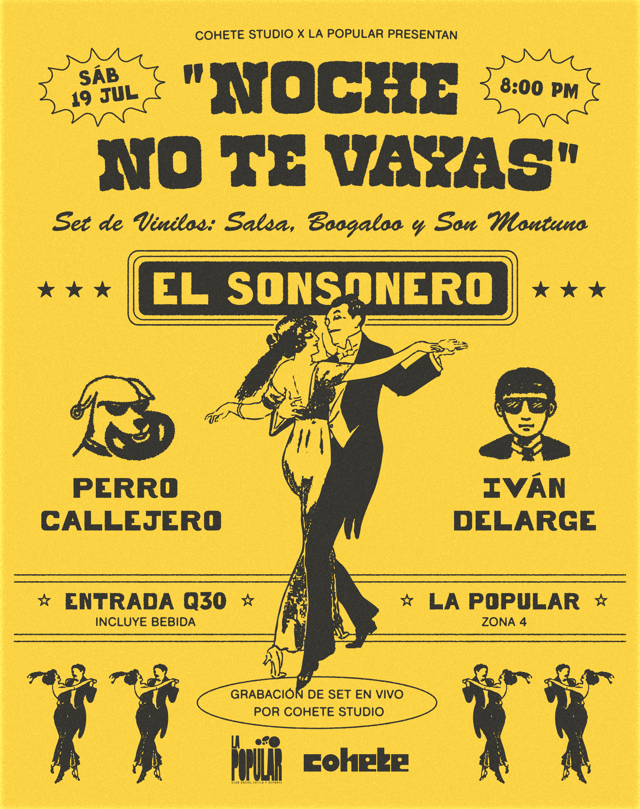 Poster for Noche No Te Vayas, a vinyl-only salsa DJ event in Guatemala City. (2025)